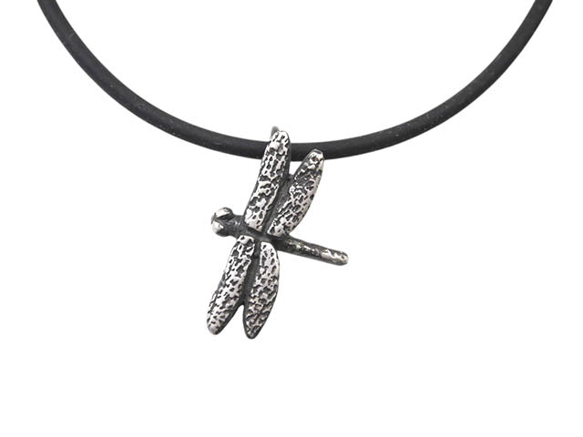 This Green Darner Dragonfly is handcrafted in recycled sterling silver and hangs from an 18" black rubber cord. On the underside of the dragonfly's body, on its thorax, you'll find a heart.